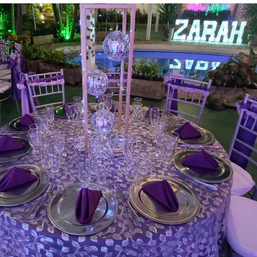 - Mobiliario y equipo: Alquiler de mesas, sillas, luces y sonido de última tecnología.